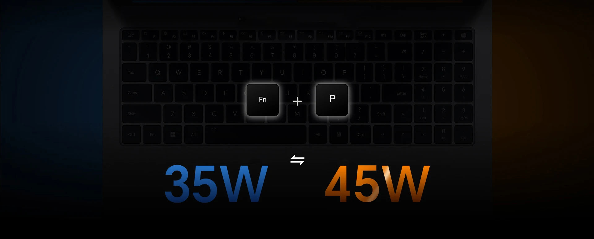 Switch modes with FN+P: Smart mode at 35W and Performance mode at 45W.